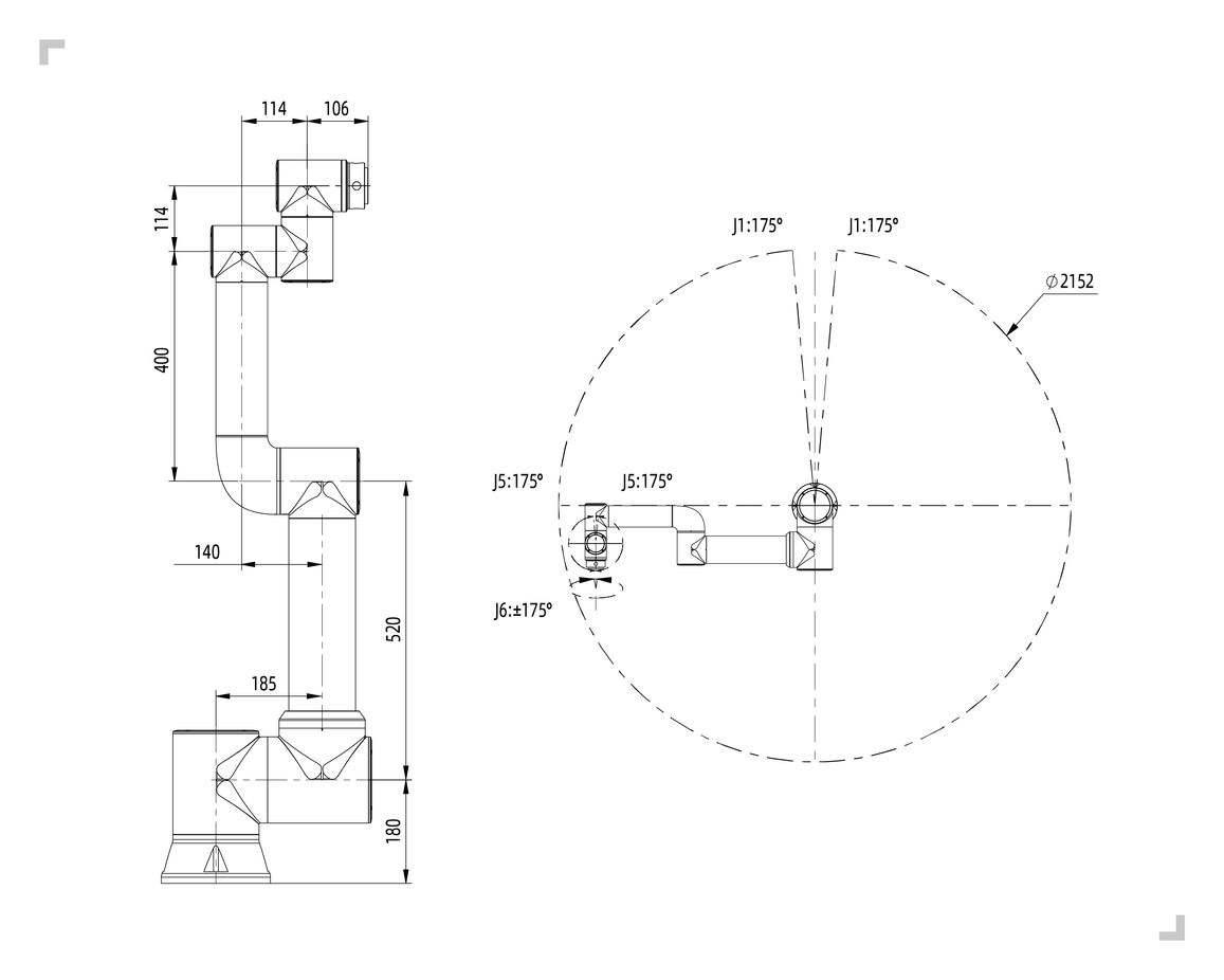 ペイロードは16kg、最大リーチは1,034mm、繰り返し精度は±0.03mm、最高速度は1.0m/s、本体重量は約40kg(ワイヤー類を除く)です。